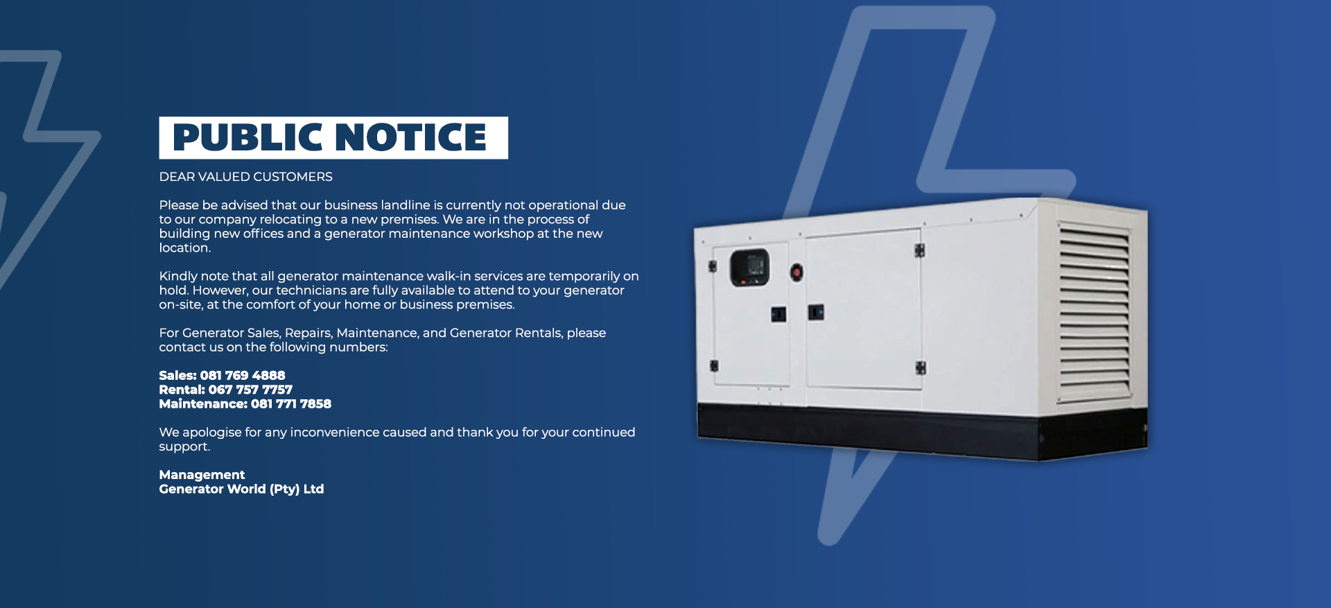 Generator World is a 100% black owned company impeccable experience on our services. We are know for quality service and friendly approach to business, which is why we continue to invest in new equipment to ensure we provide customers with innovative, reliable generators and 24/7 support.